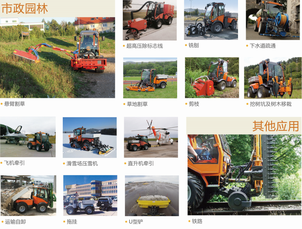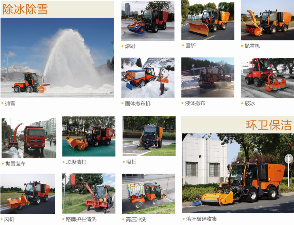 T90主要功能有道路清掃、落葉收集破碎、高壓沖洗、鏟雪、掃雪、吹雪、拋雪、固體/液體撒布、割草、剪枝、移樹、路面銑刨、農(nóng)藥噴灑等。